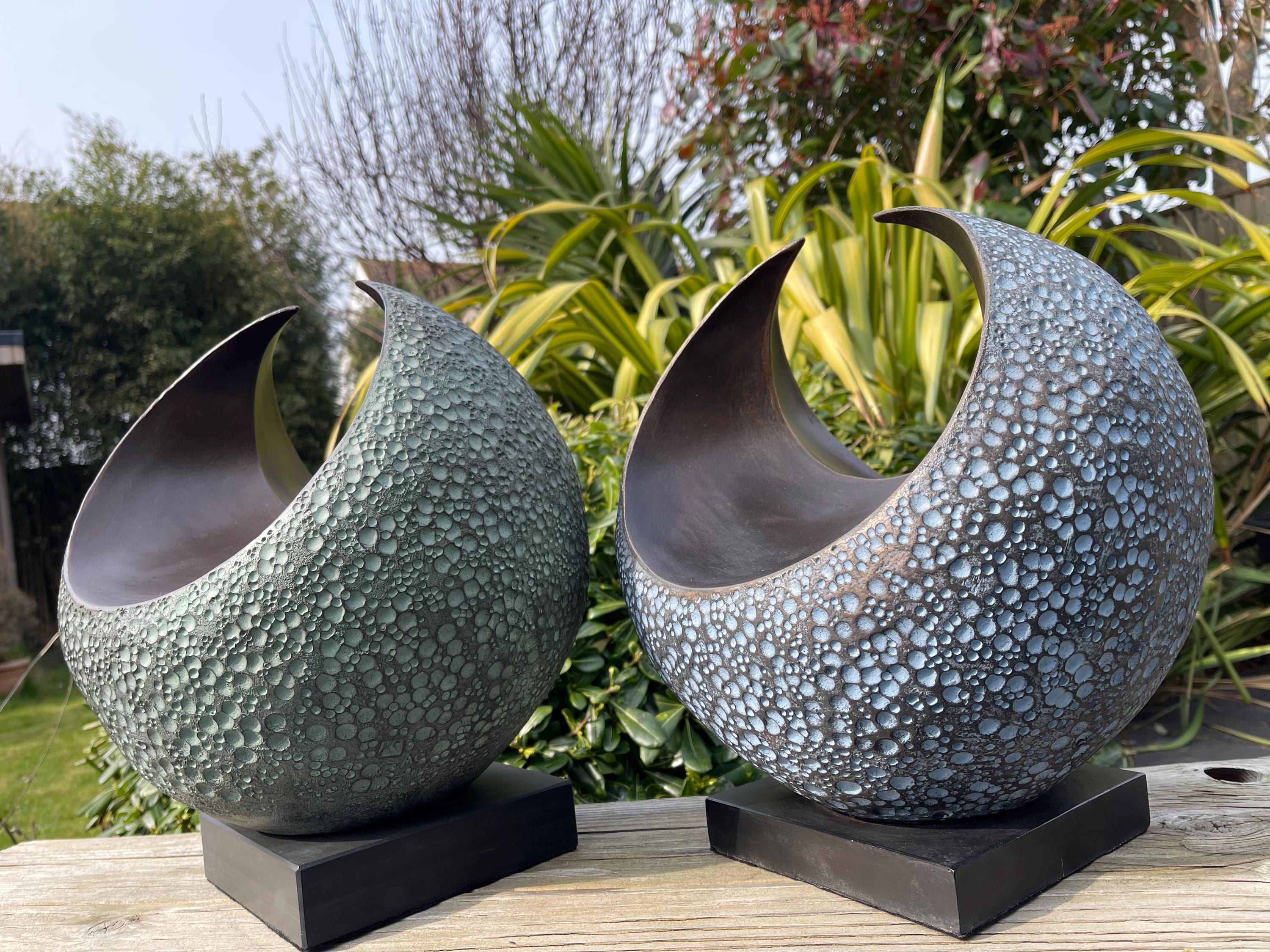 With its elegant crescent form, Curvation is a modern contemporary abstract sculpture that contrasts texture and smoothness in a striking design. Handmade in cold cast bronze and resin, each numbered edition piece is individually finished with a pale blue patination across its textured outer surface, which is marked by uneven round indentations. The inner curves of the crescent reveal a smooth dark brown bronze finish, creating a play of light, colour, and form. Suitable for gardens, patios, landscaped spaces, or interiors, Curvation blends the timeless appeal of bronze with the durability of resin, offering a sculpture that is both bold and harmonious.