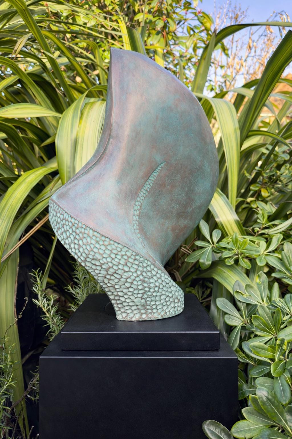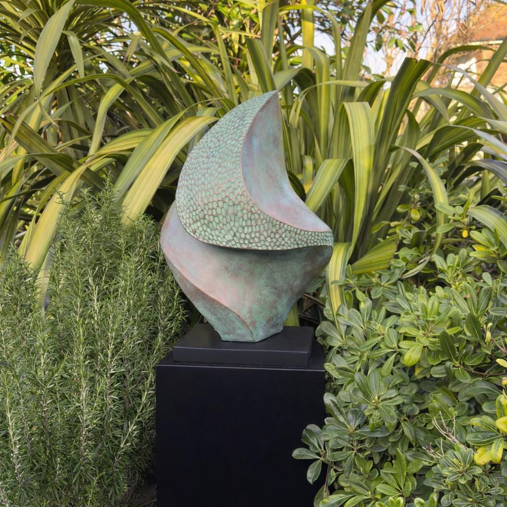 Crafted in bronze and resin, the sculpture features a rich verdigris patina that brings depth, texture and an organic coastal character. The surface catches the light beautifully, revealing subtle tonal variations that shift with the seasons and surroundings.